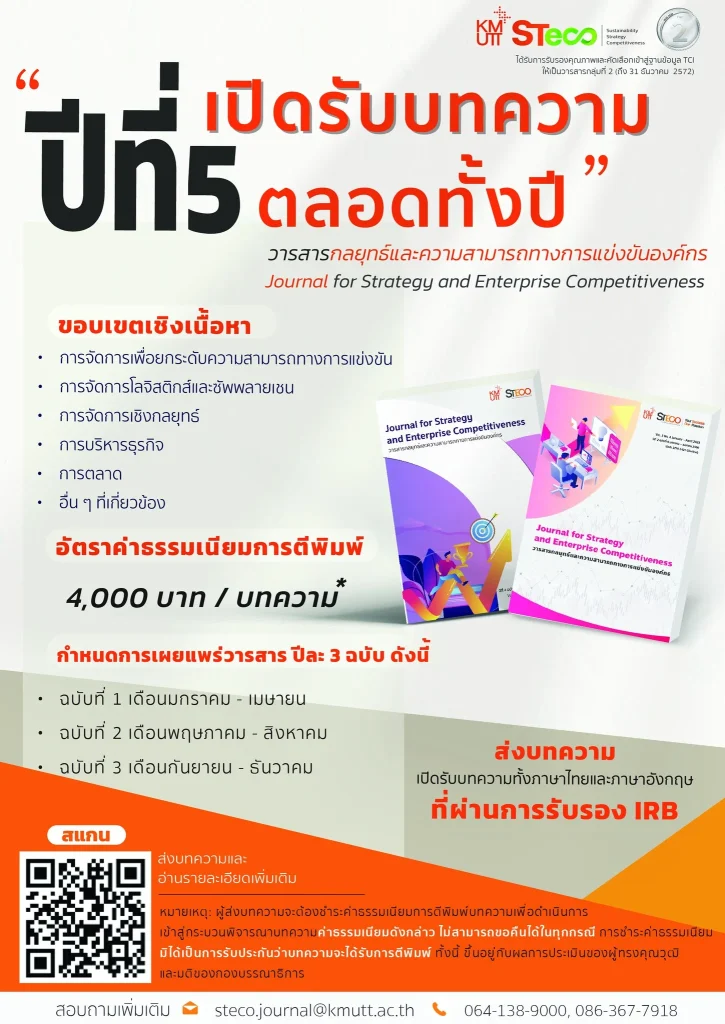 วารสารกลยุทธ์และความสามารถทางการแข่งขันองค์กร เป็นวารสารอิเล็กทรอนิกส์ ISSN: 2774-1427 (Online) รับเผยแพร่บทความวิจัยและบทความวิชาการที่แสดงให้เห็นถึงความสร้างสรรค์องค์ความรู้