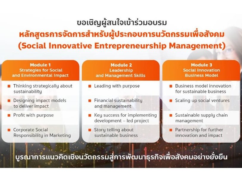 ศูนย์กลยุทธ์และความสามารถทางการแข่งขันองค์กร (STECO) มหาวิทยาลัยเทคโนโลยีพระจอมเกล้าธนบุรี ร่วมกับศูนย์พัฒนาและเผยแพร่องค์ความรู้ มูลนิธิแม่ฟ้าหลวงในพระบรมราชูปถัมภ์ ขอเชิญผู้สนใจเข้าร่วมอบรม หลักสูตร : การจัดการสำหรับผู้ประกอบการนวัตกรรมเพื่อสังคม (Social Innovative Entrepreneurship Management) “บูรณาการแนวคิดเชิงนวัตกรรมสู่การพัฒนาธุรกิจเพื่อสังคมอย่างยั่งยืน”