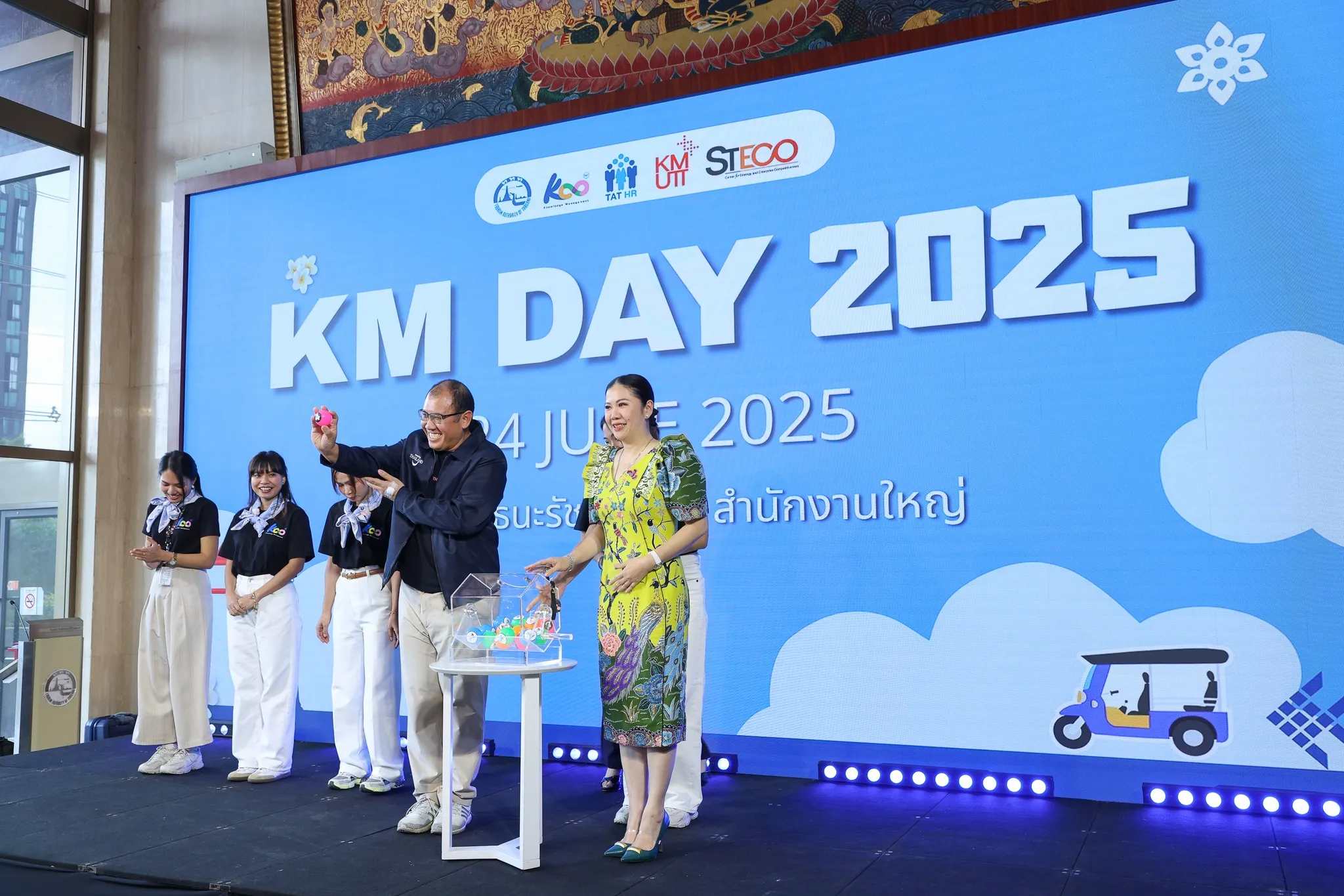 คุณจิราณี พูนนายม ผู้อำนวยการฝ่ายทรัพยากรบุคคล กล่าวรายงานวัตถุประสงค์ของโครงการเพื่อให้บุคลากร ททท. ทุกหน่วยงานร่วมชมผลงานและเรียนรู้แนวทางการจัดการความรู้จาก KM Team เปิดโลกแห่งความรู้ แลกเปลี่ยนประสบการณ์จริง และสร้างแรงบันดาลใจในการพัฒนาองค์กร และคุณฐาปนีย์ เกียรติไพบูลย์ ผู้ว่าการ ททท. กล่าวเปิดกิจกรรมและมีความยินดีเป็นอย่างยิ่งที่ได้มาเป็นส่วนหนึ่งของกิจกรรม KM Day 2025 ในวันนี้ ซึ่งนับเป็นอีกหนึ่งเวทีสำคัญที่แสดงให้เห็นถึงความมุ่งมั่นของชาว ททท. ในการยกระดับการจัดการความรู้ให้เป็นระบบ เป็นรูปธรรม และมีส่วนสำคัญในการขับเคลื่อนองค์กรของเราให้ก้าวทันกับการเปลี่ยนแปลง พร้อมกิจกรรมไฮไลต์การสุ่มหมายเลขเป้าหมายการจัดเก็บองค์ความรู้ปี 2568 ซึ่งตรงกับเป้าหมาย 124 องค์ความรู้ที่ ททท. ตั้งใจจะดำเนินการให้สำเร็จในปีนี้