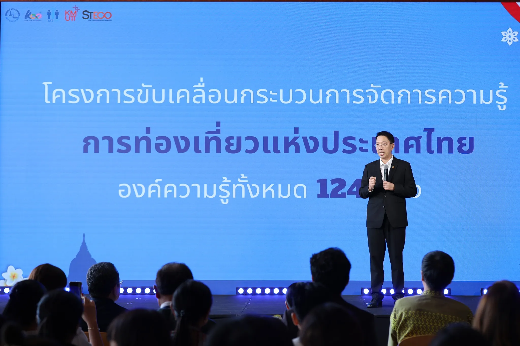 จากนั้น ผู้ช่วยศาสตราจารย์ ดร.วัชรพจน์ ทรัพย์สงวนบุญ ผู้อำนวยการศูนย์กลยุทธ์และความสามารถทางการแข่งขันองค์กร และผู้จัดการโครงการ กล่าวถึงกิจกรรมภายใต้โครงการตลอดปีที่ผ่านมา ได้แก่ การอบรมเชิงปฏิบัติการเพื่อจัดทำ KM Action Plan การจัดเก็บองค์ความรู้จากทุกหน่วยงาน การคัดเลือก KM Role Model การประเมินสมรรถนะด้านการจัดการความรู้ และการศึกษาดูงานองค์กรชั้นนำ รวมถึงเวทีแลกเปลี่ยนเรียนรู้ครั้งสำคัญในวันนี้ที่รบรวมองค์ความรู้ได้ทั้งหมด 124 องค์ความรู้